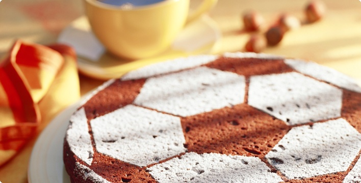 - Eine Fußball-Schablone auf Pappkarton zeichnen, Elemente ausschneiden (geht am besten mit einem Cutter-Messer) und die Schablone auf den Kuchen legen. Den Kuchen mit Puderzucker dick bestäuben und die Schablone vorsichtig entfernen.