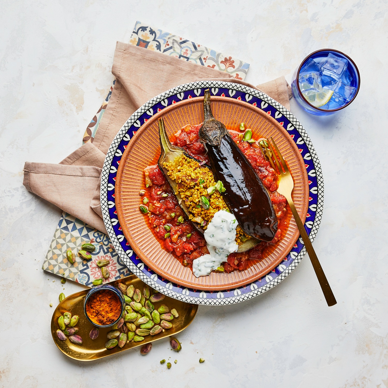 Entdecke die aromatische Welt des Orients: Gebackene Auberginen gefüllt mit würzigem Couscous auf nussigem Tomatenspiegel. Zum Rezept