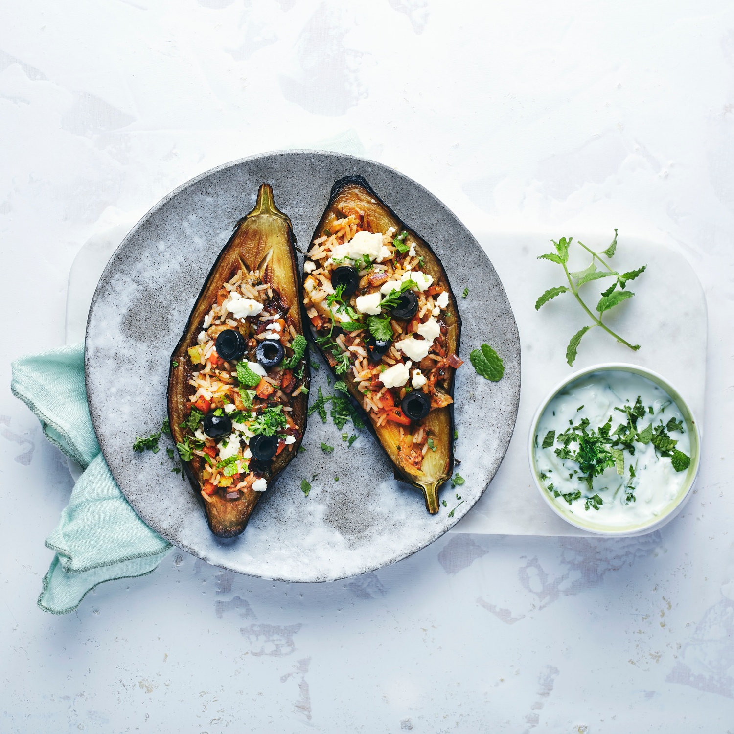 Lust auf griechisch? Dieses Ofengericht verführt mit mediterranen Aromen und typischem Mittelmeer-Gemüse. Die Auberginen werden mit Reis und Gemüse gefüllt. Dazu gibt es einen feinen Joghurt-Gurken-Dip. Zum Rezept