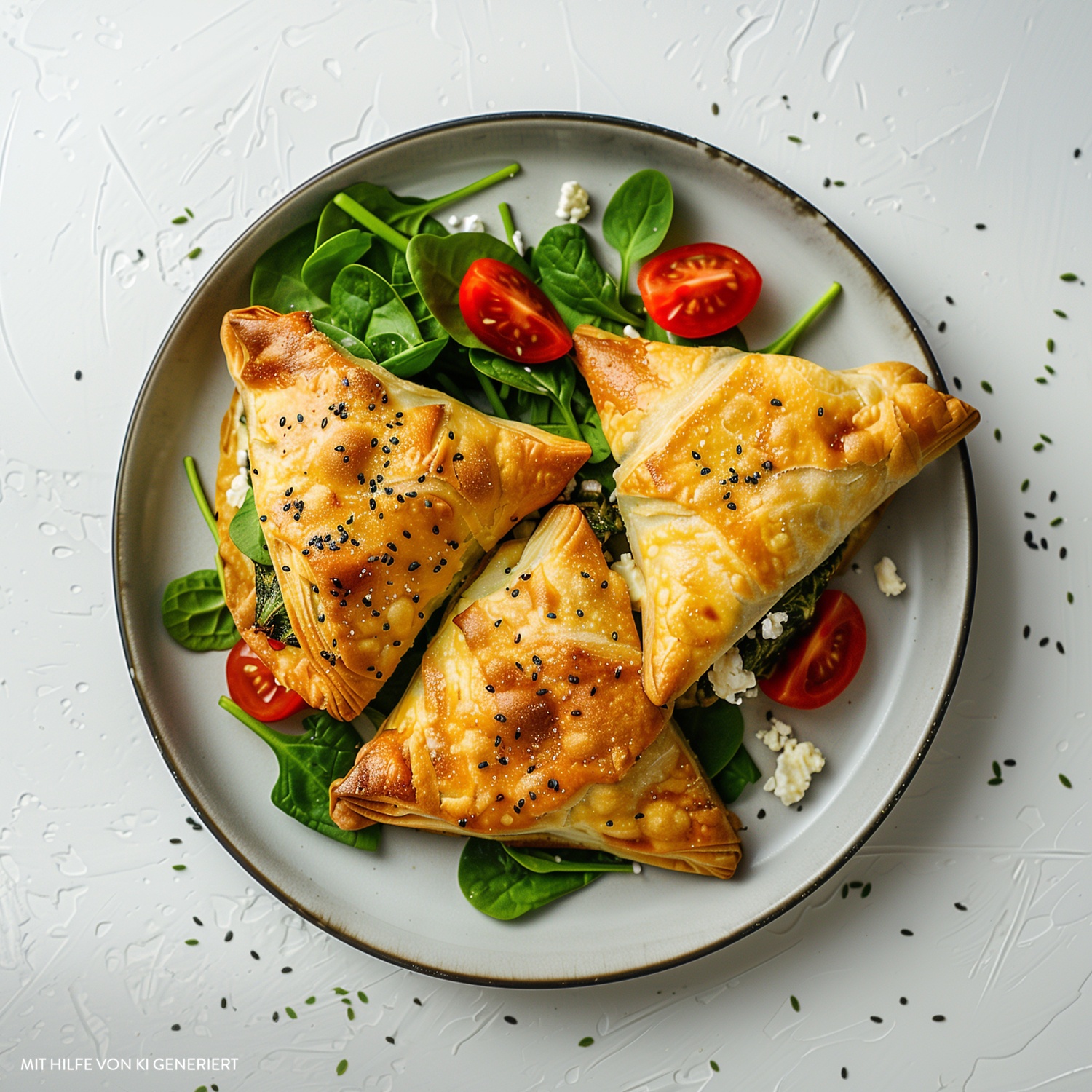 - Die gefüllten Blätterteigtaschen auf dem Salat anrichten und servieren.