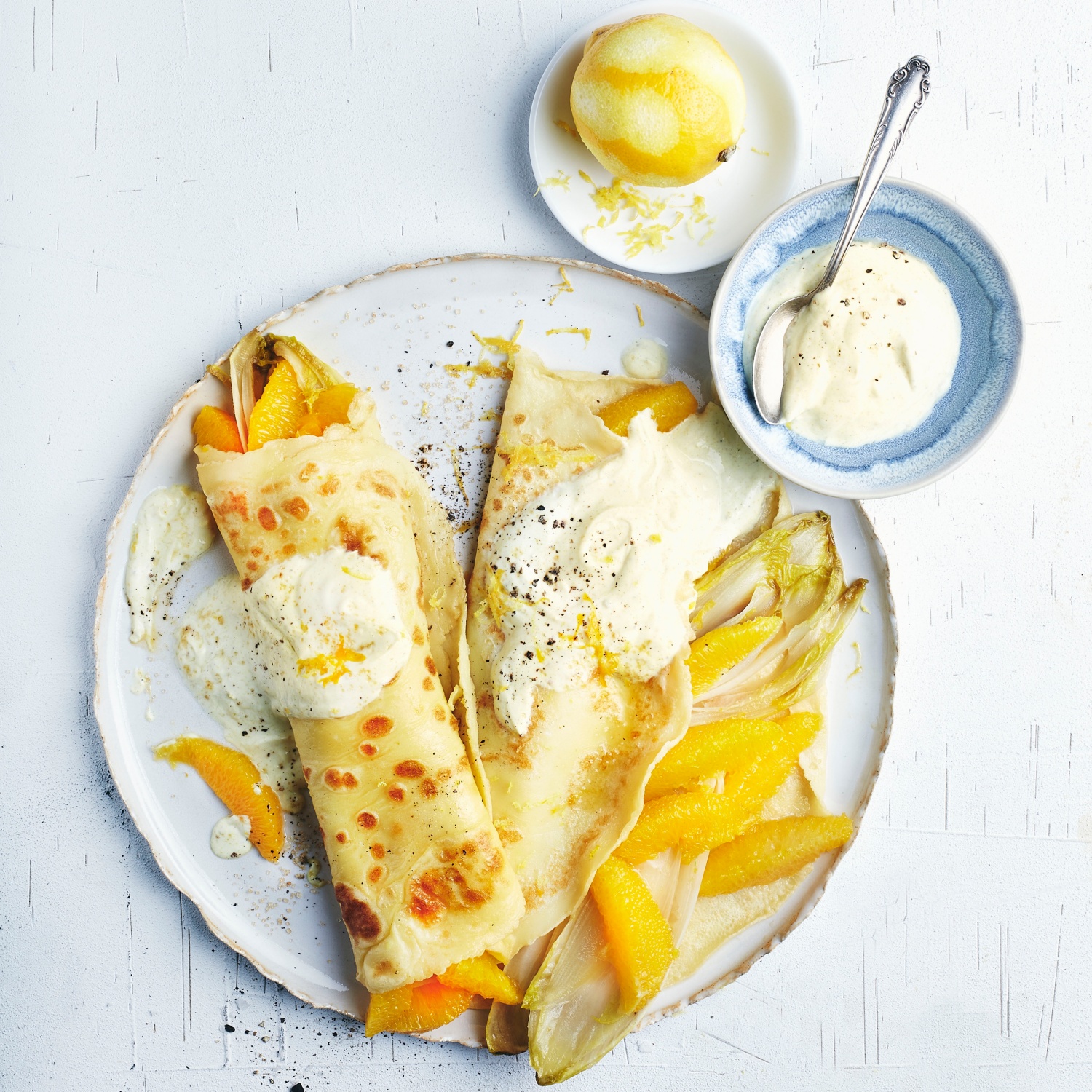 Gefüllte Crêpes sind ein Dauerbrenner und es gibt sie in vielen Varianten. In dieser süß-pikanten und wahlweise laktosefreien Version werden sie mit einer Füllung aus Orangen und Chicorée serviert. Zum Rezept