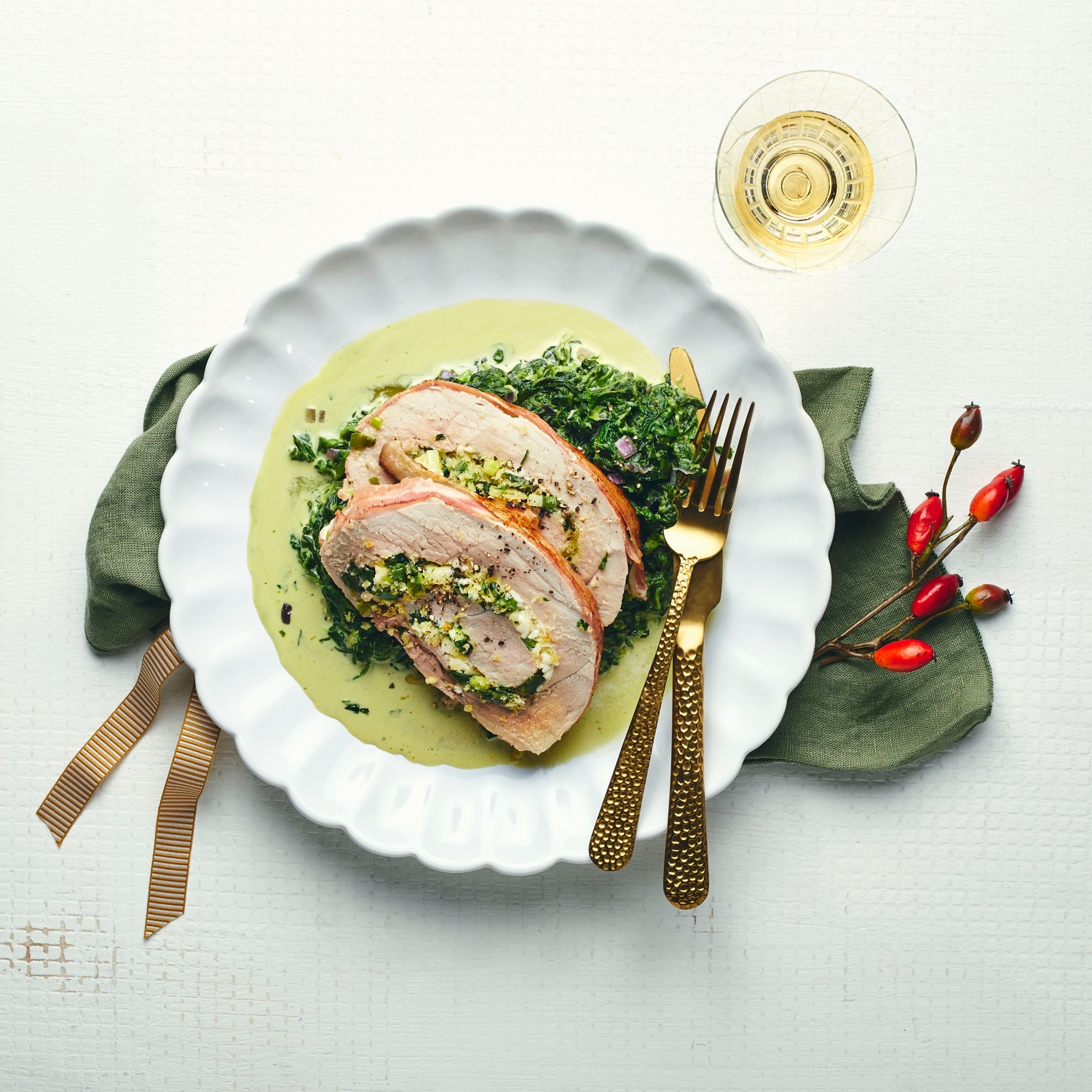 Gefüllter Nackenbraten mit Feta, Speck und Rahm-Spinat