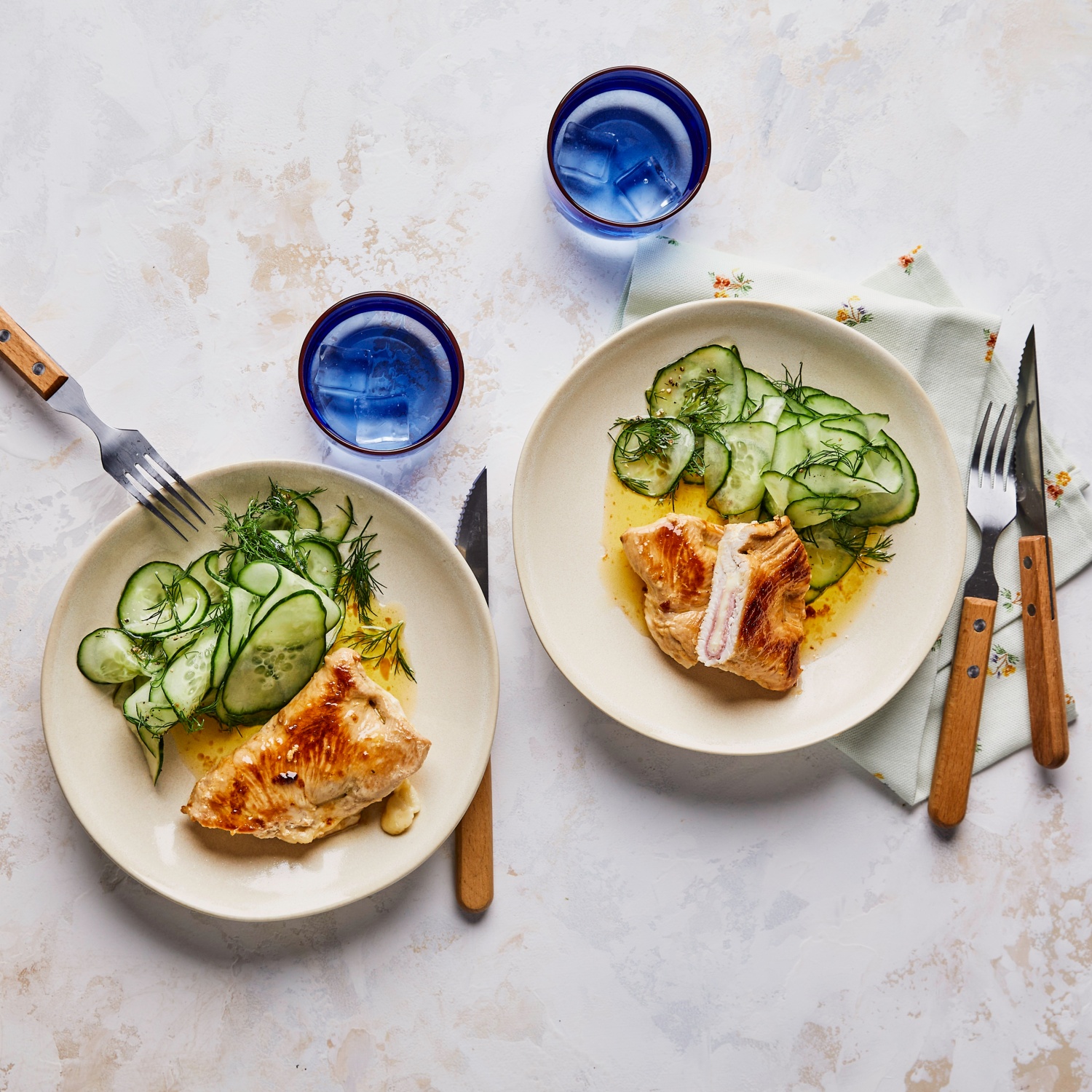 Genuss für alle Sinne: Probiere unser Putenschnitzel, meisterhaft gefüllt mit Schinken und Käse. Dazu gibt es einen frischen Gurkensalat mit Dill. Zum Rezept