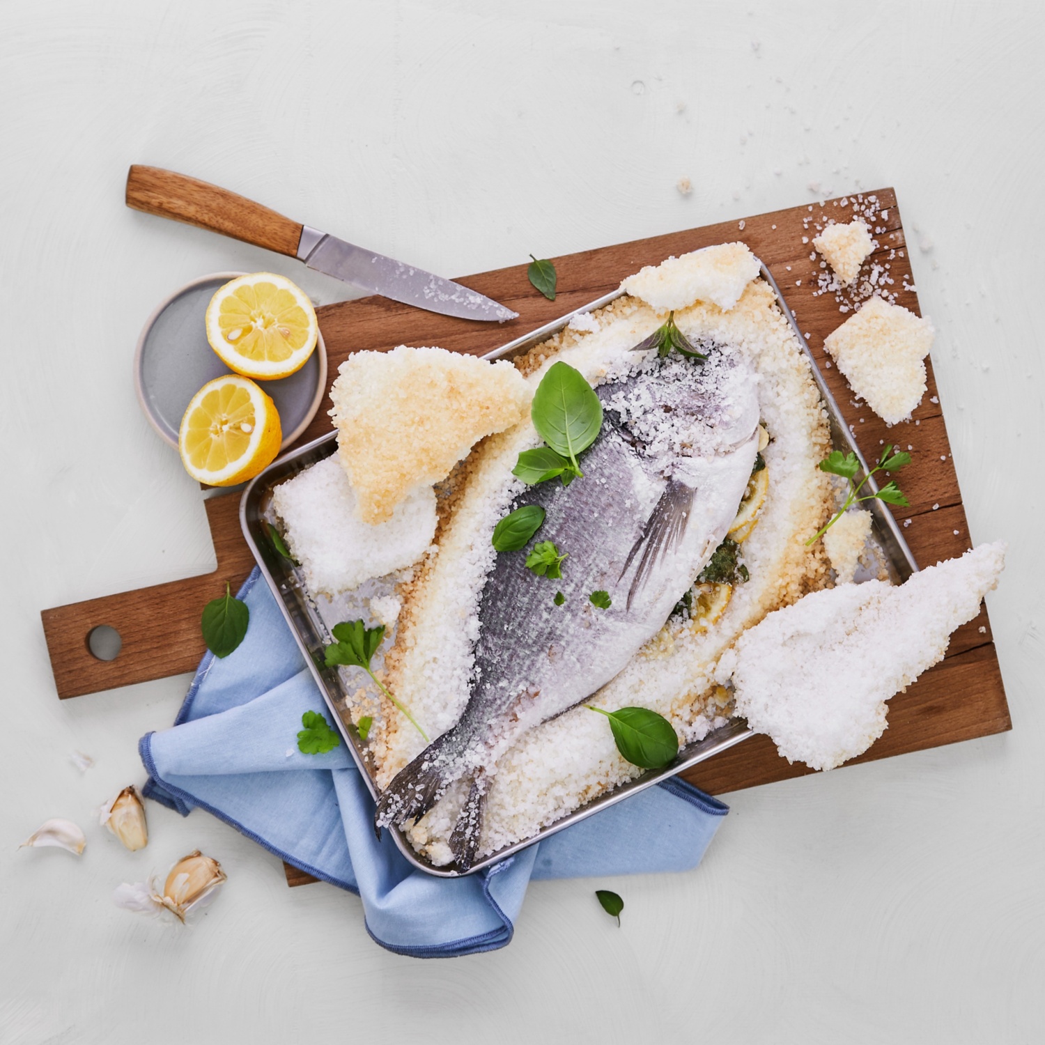 Die gegrillte Dorade im Salzmantel ist mit leckeren Kräutern, Knoblauch und Zitrone gefüllt. Durch den Salzmantel bleibt sie besonders saftig und aromatisch. Zum Rezept