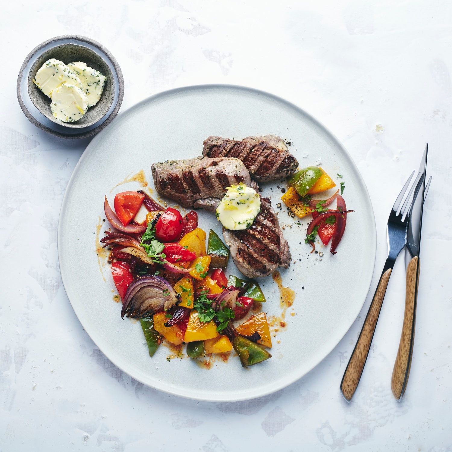 Gegrillte Lammfilets mit Paprika-Tomatengemüse und Minzbutter