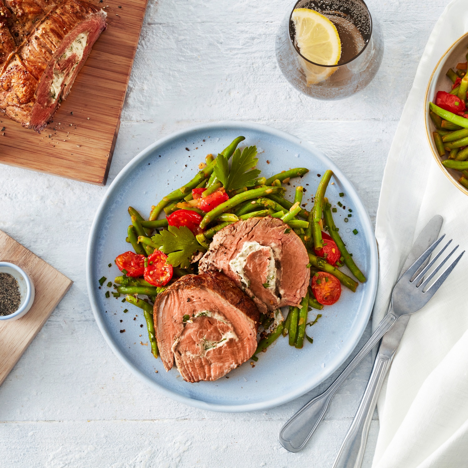 Gegrillte Rinderroulade mit Kräuterfrischkäse & buntem Bohnensalat