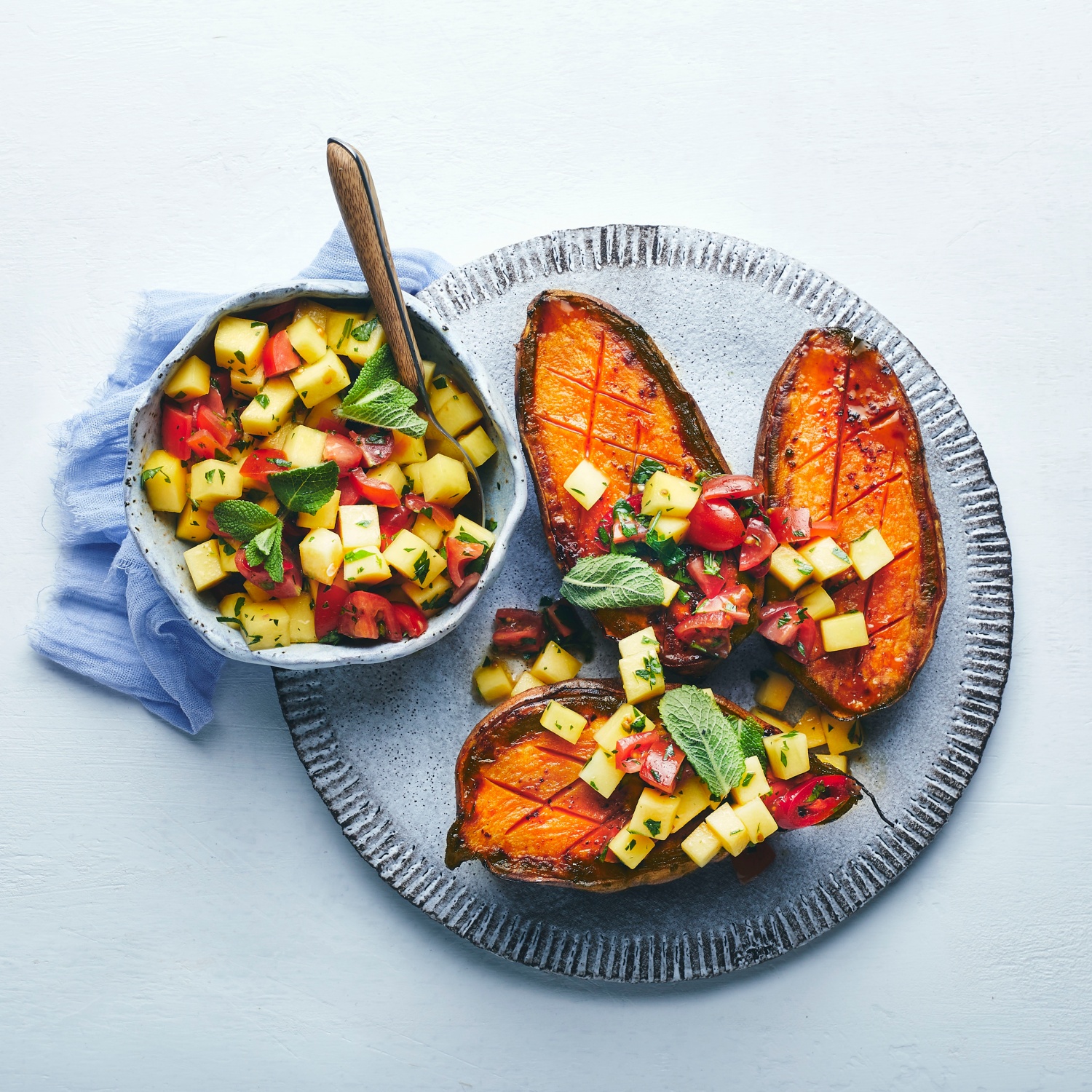 Gegrillte Süßkartoffeln mit Tomaten-Mango-Salsa
