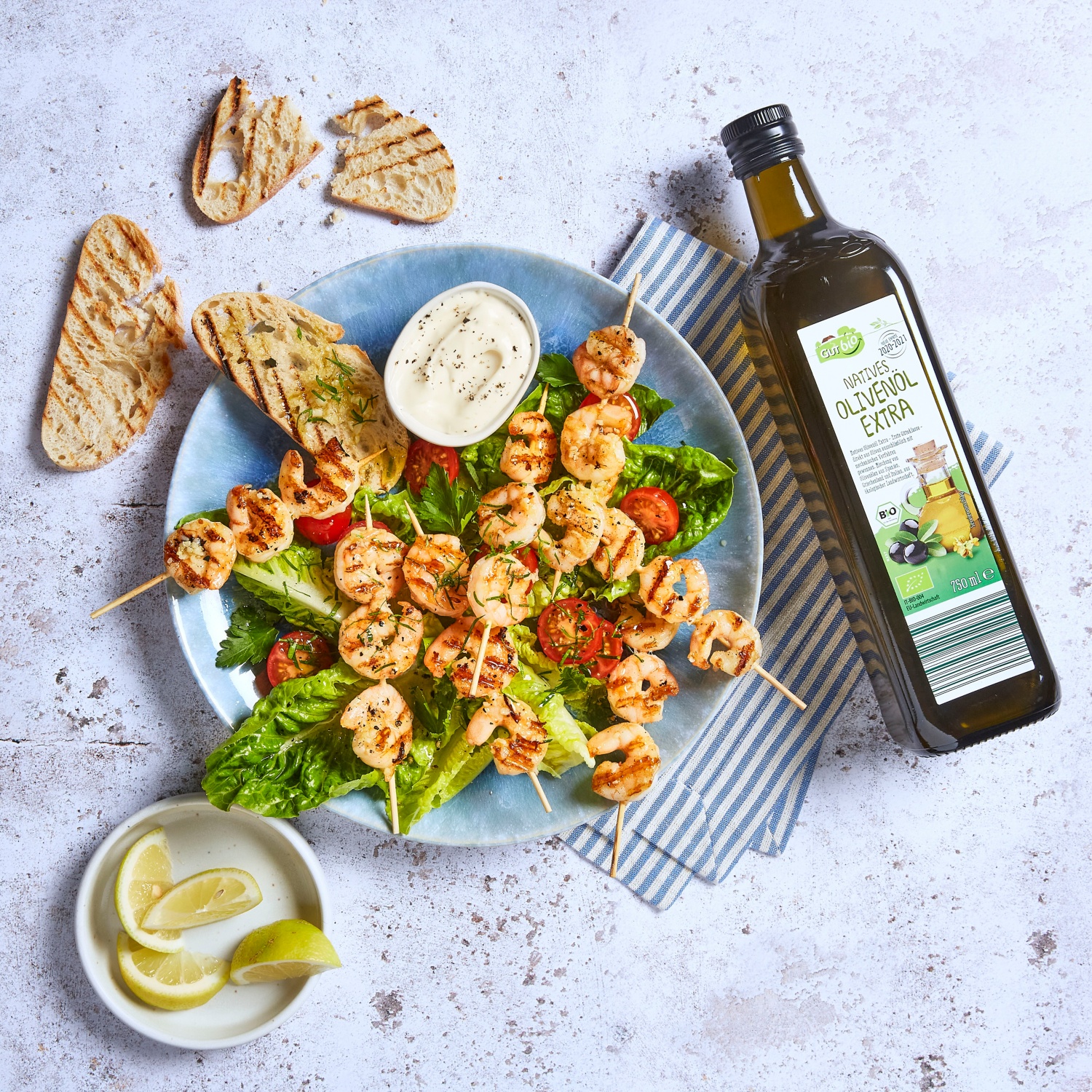 - Garnelenschwänze zu gleichen Teilen auf die Spieße stecken und in dem gewürzten Olivenöl 1 Stunde im Kühlschrank marinieren. Währenddessen die Mayonnaise mit dem Saft einer halben Zitrone verrühren und mit viel Pfeffer würzen.