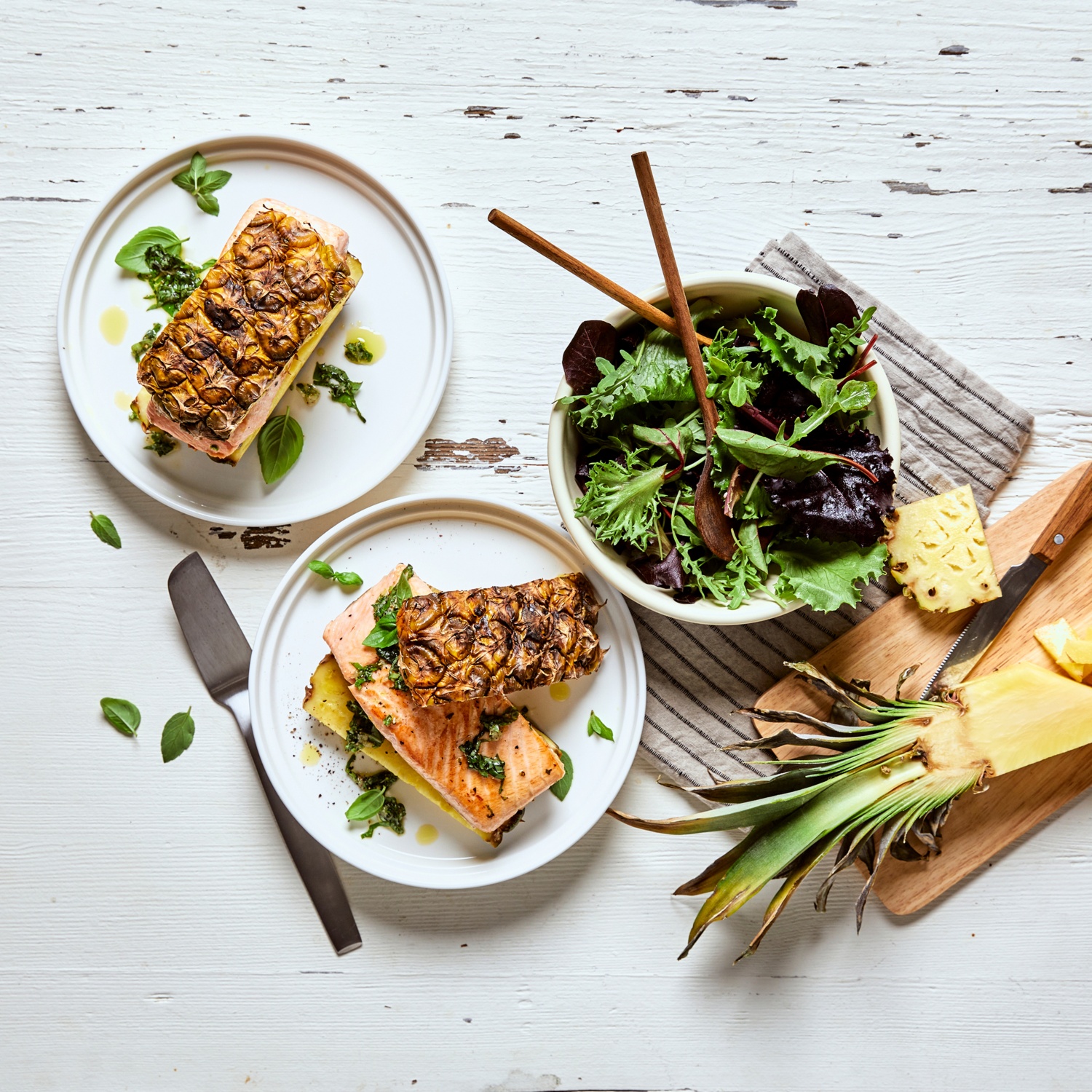 - Vier Ananasspalten mit der Schale nach unten hinlegen und je ein Lachsfilets drauflegen. Mit jeweils einer weiteren Ananasscheibe abdecken. Die vier Ananas-Lachs-Pakete mit Küchengarn zusammenbinden, damit nichts auseinanderfällt.
