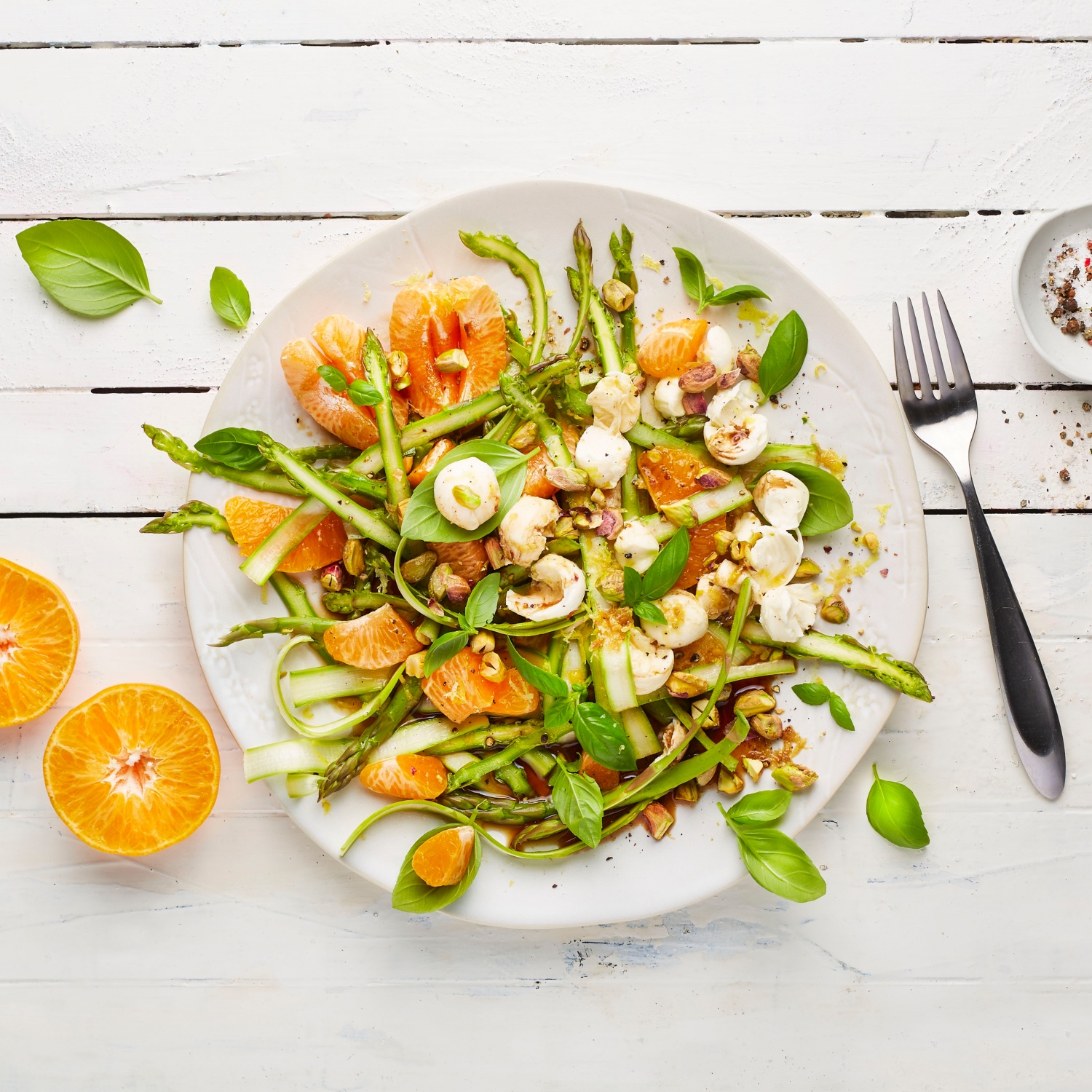 Gehobelter Spargelsalat mit Mini-Mozzarellas, Clementinen und Pistazien