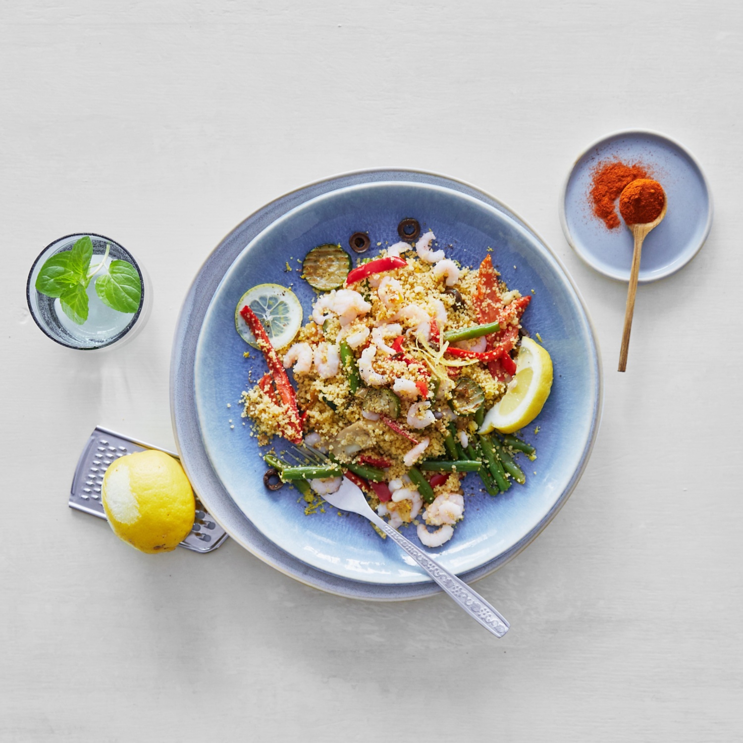 - Die vorgekochten Mini-Garnelen unter den Gemüse-Couscous mischen.