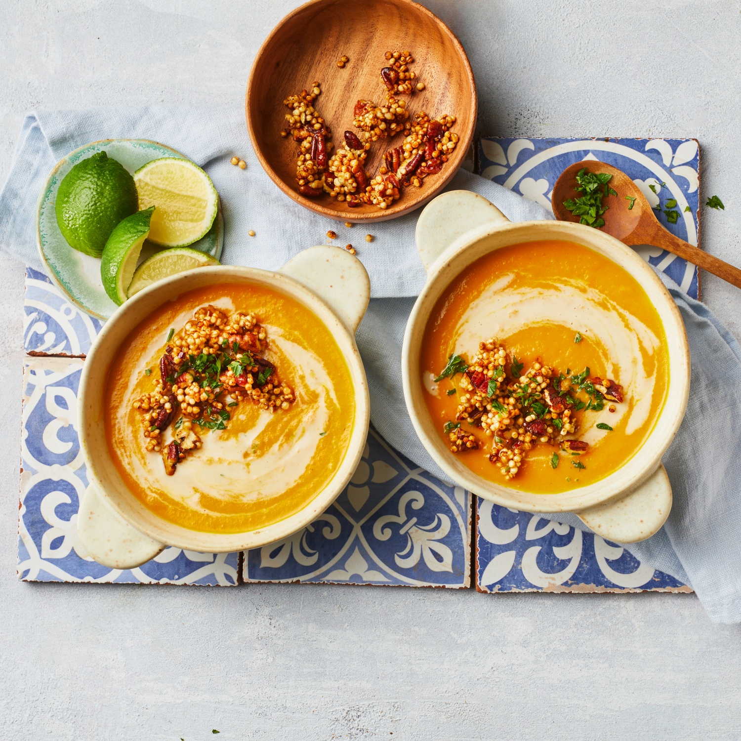 - Die Suppe auf die Teller geben, je 2 EL Nuss-Sahne einrühren und die knusprige Quinoa-Masse als Topping darüber zerbröckeln.
