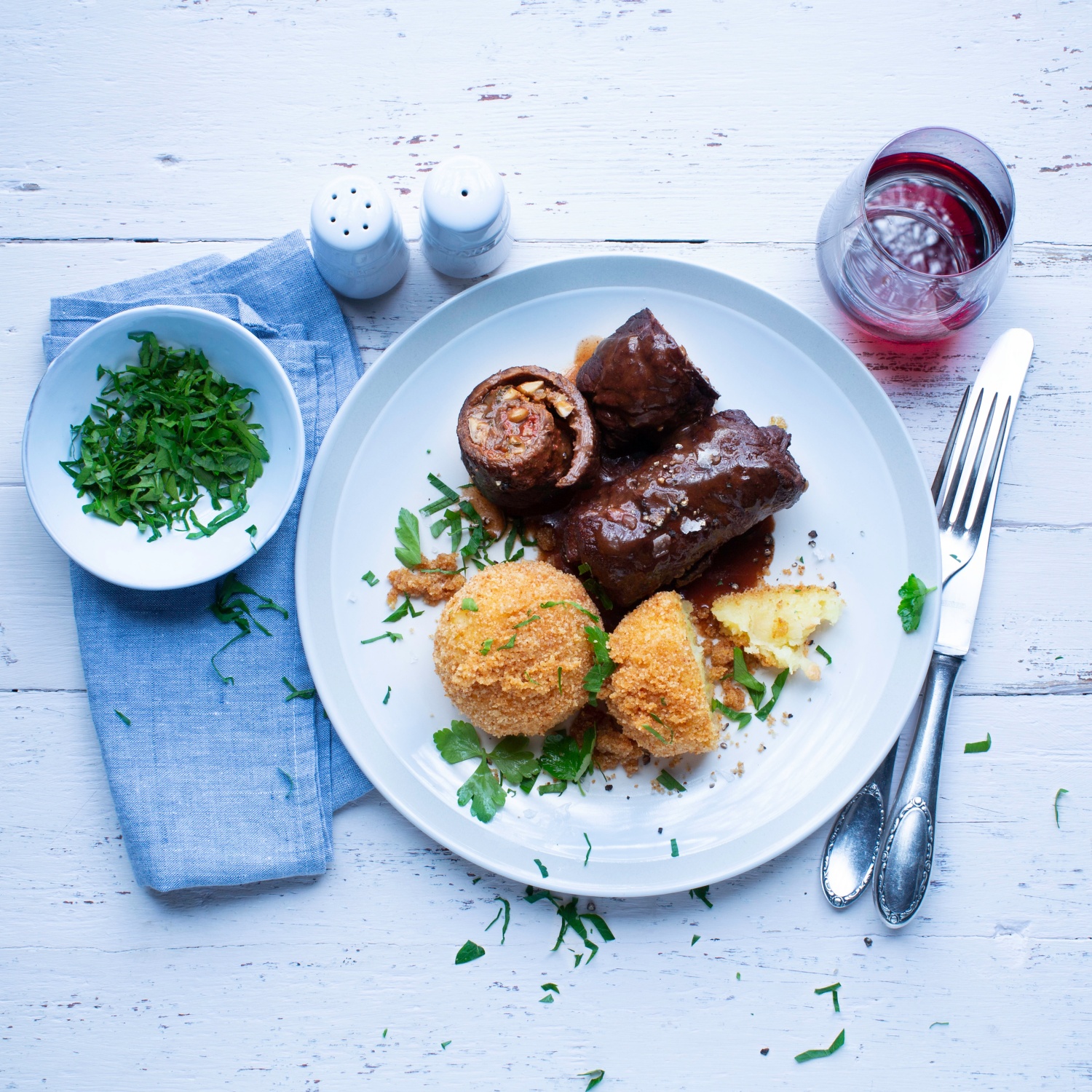 Geschmorte Rinderroulade mit Champignonfüllung, Portweinsauce und Kartoffelknödeln