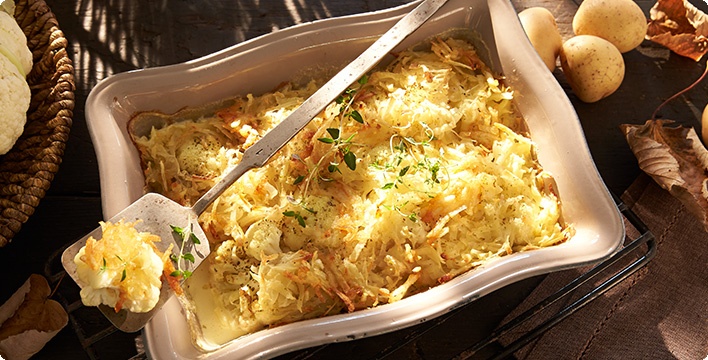 - Blumenkohl in die gefettete Auflaufform geben und geraspelte Kartoffeln darüber verteilen. Alles mit Sahne begießen und im Ofen ca. 40 Minuten backen. 5 Minuten vor Garzeitende gehobelte Mandeln auf der Kartoffelkruste verteilen und zu Ende backen.