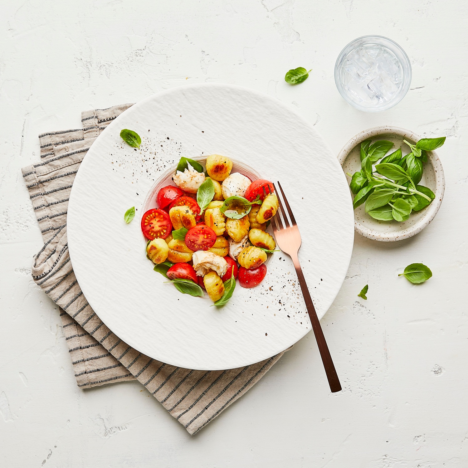 Die Gnocchi, die Tomaten, Mini-Mozzarella und das Basilikum in einer großen Schüssel vermengen.