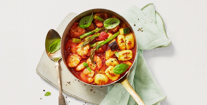 5. Mit Paprikapulver, Salz und Pfeffer würzen und mit dem Honig abschmecken. Die Gnocchi und die Garnelen hineingeben, erwärmen und servieren.