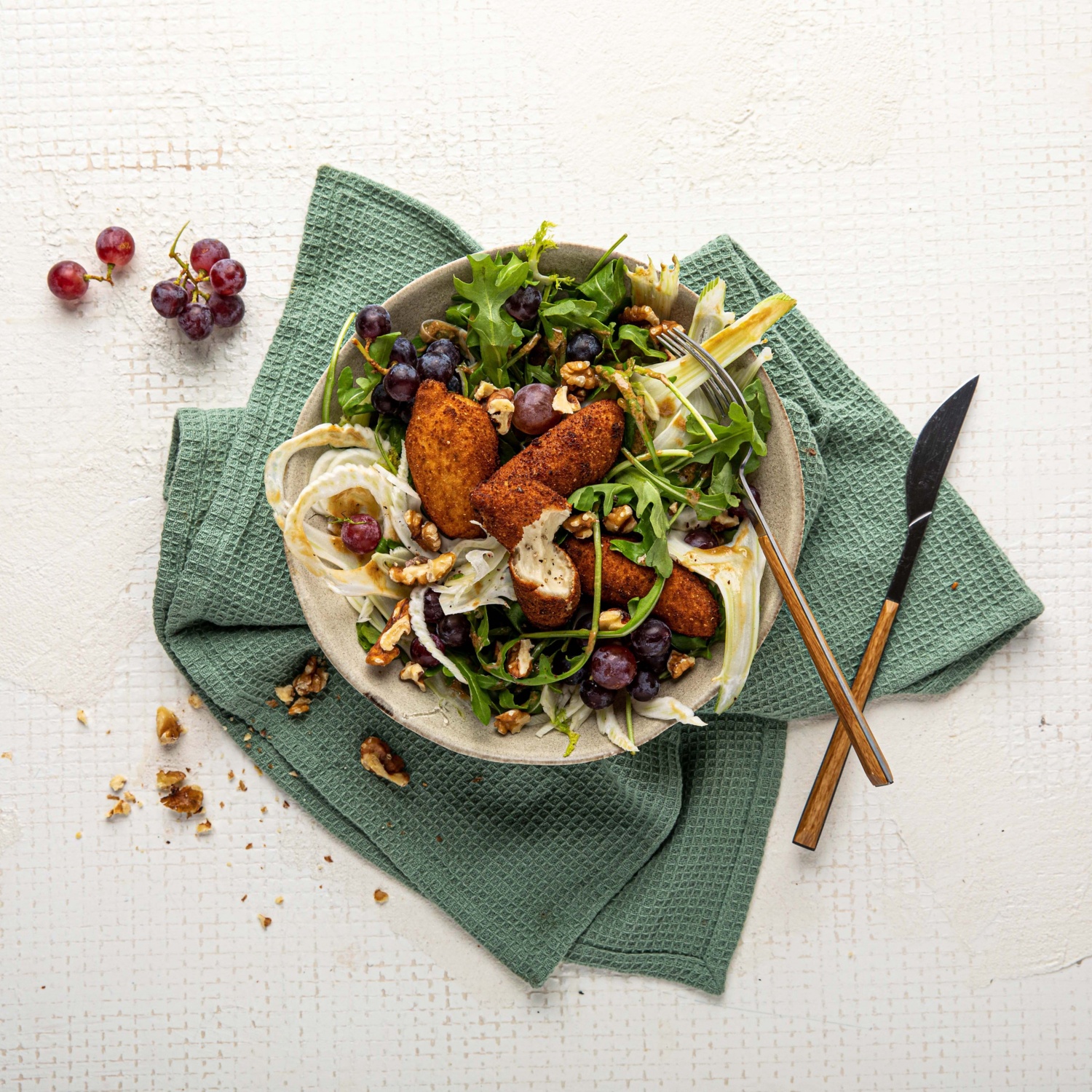 - Den Fenchel waschen, putzen und hobeln. Den Rucola waschen. Die Weintrauben waschen. ggf. halbieren. Aus dem Olivenöl, dem Balsamico, dem Senf, Pfeffer und Salz eine Vinaigrette rühren. Die Walnüsse hacken.