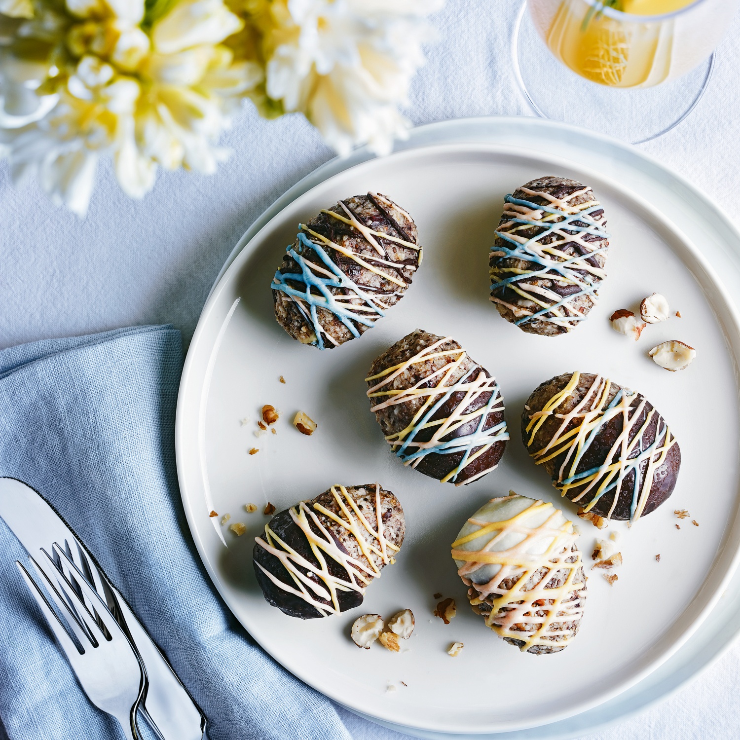 Köstliche Ostereier, hübsch verziert. Die Granola-Eier mit getrockneten Früchten und Schokolade sind eine nahrhafte Alternative für alle Naschkatzen und Osterfans. Zum Rezept