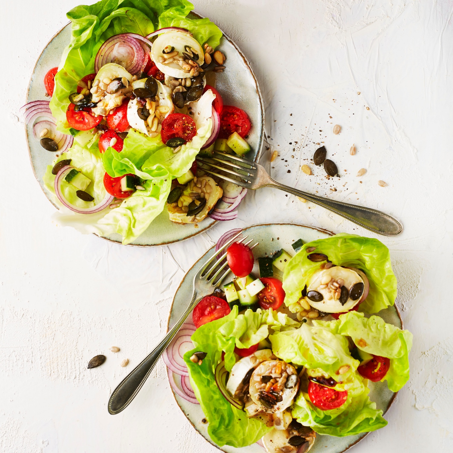 - Den Salat, die Gurke und die Tomaten waschen und in mundgerechte Stücke schneiden. Die halbe Zitrone auspressen und 1 TL Zitronensaft mit 4 EL Öl, dem Orangensaft und 2 EL Honig mit dem Schneebesen verrühren. Mit Pfeffer und Salz abschmecken.