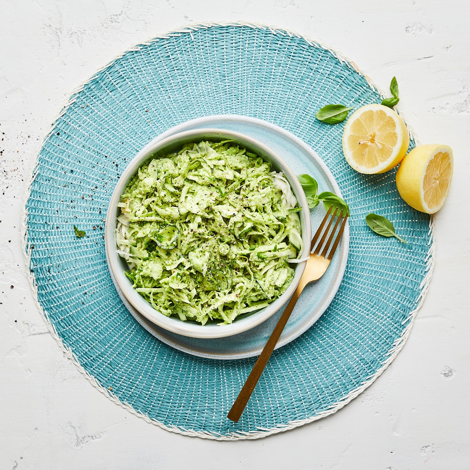 - Den Knoblauch, das Basilikum, den Spinat und die Avocado zusammen mit den Walnüssen, etwas Zitronensaft, Olivenöl Salz und Pfeffer zu einem cremigen Dressing pürieren.
