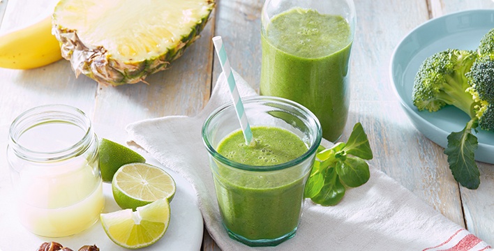 - Mixer mit Feldsalat, Brokkoli und Wasser füllen und anschließend bei niedriger Geschwindigkeit ca. 30 Sekunden mixen. Kiwis, Banane, Ananas und Datteln hinzugeben und alles bei höchster Geschwindigkeit weitere 20 bis 30 Sekunden mixen. Vor dem Servieren mit etwas Zitronen- oder Limettensaft abschmecken - fertig!