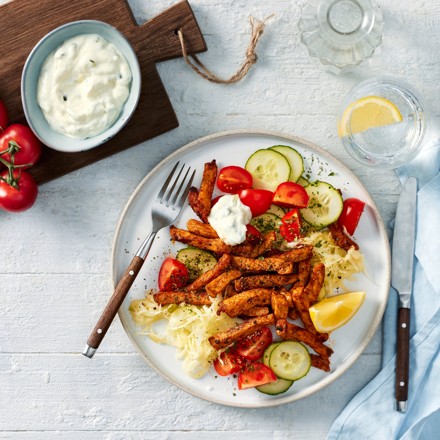 - Gyros mit Krautsalat, Gurken, Tomaten und 1 Klecks Tzatziki anrichten. Mit Petersilie und Pfeffer bestreuen. Mit Zitrone garnieren. Rest Tzatziki dazu reichen.