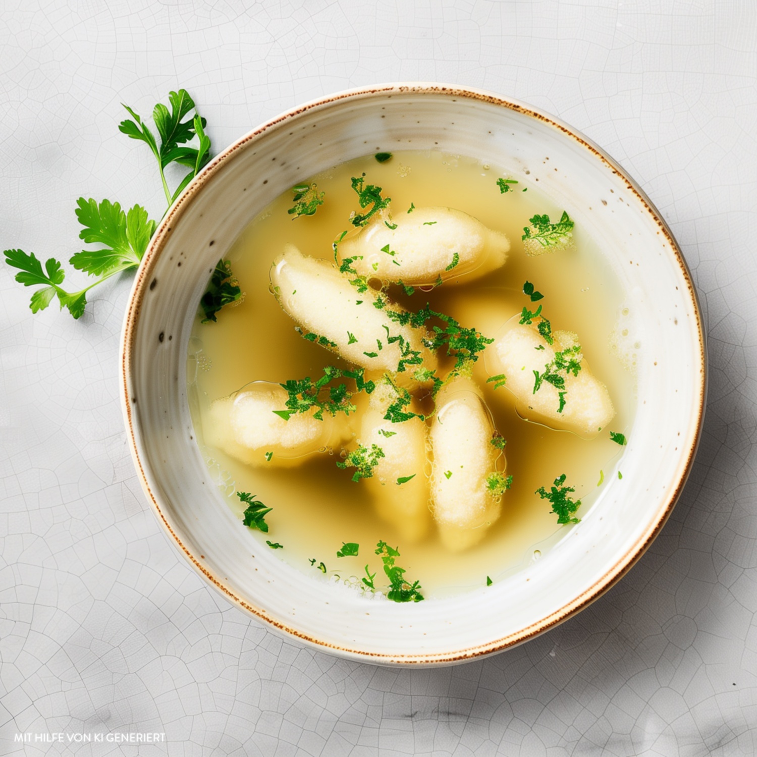 - Die Klößchen bei schwacher Hitze ca. 10–15 Minuten gar ziehen lassen, bis sie an der Oberfläche schwimmen. Die Suppe mit frischer Petersilie bestreuen.