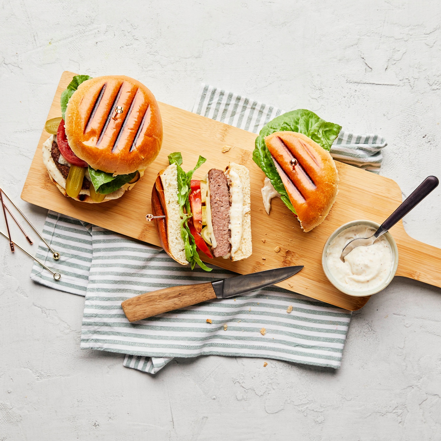 - Den Grill anheizen. Die Burgerbrötchen aufschneiden und mit den Schnittflächen nach unten kurz auf dem Grill rösten. Vom Grill nehmen.