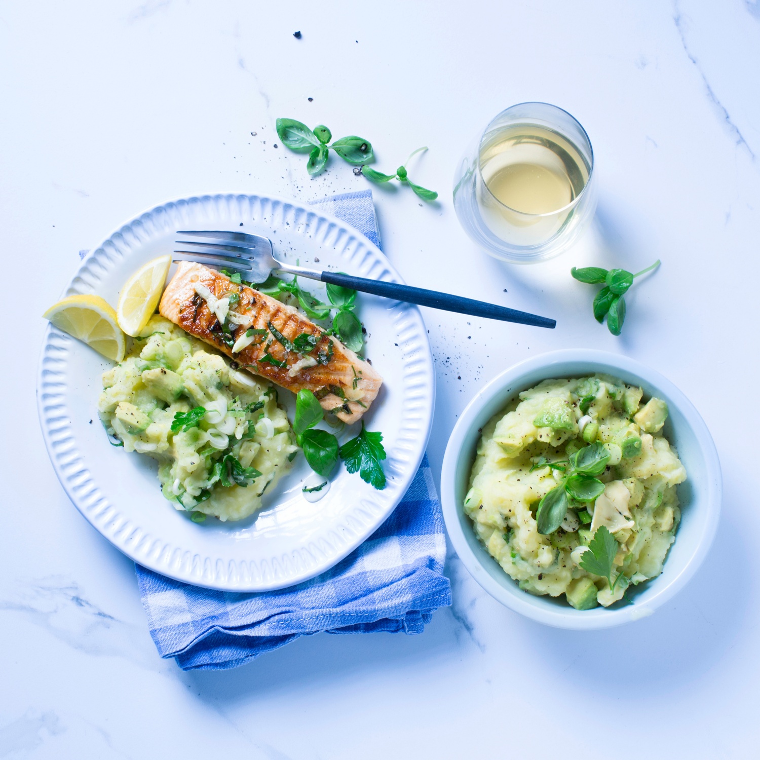 - Den Grill-Lachs mit dem Avocado-Kartoffelstampf servieren.