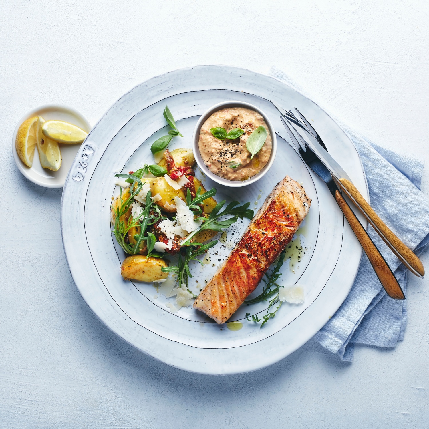 Grill-Lachs mit mediterraner Tomatencreme und Kartoffel-Pestosalat