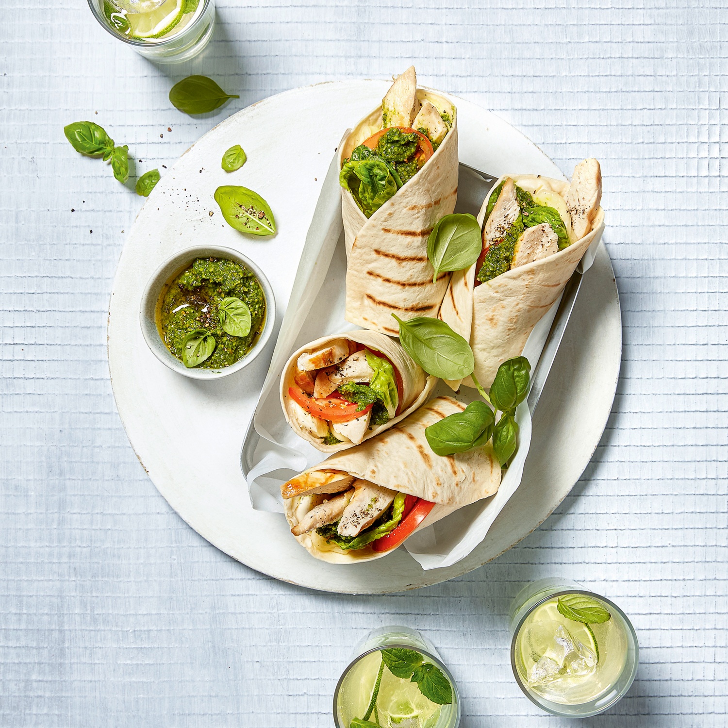 - Die Wraps in der Mitte mit 1 EL Pesto bestreichen, mit den gegrillten Hähnchenbruststreifen, 2-3 Tomatenscheiben und etwas Mozzarella belegen