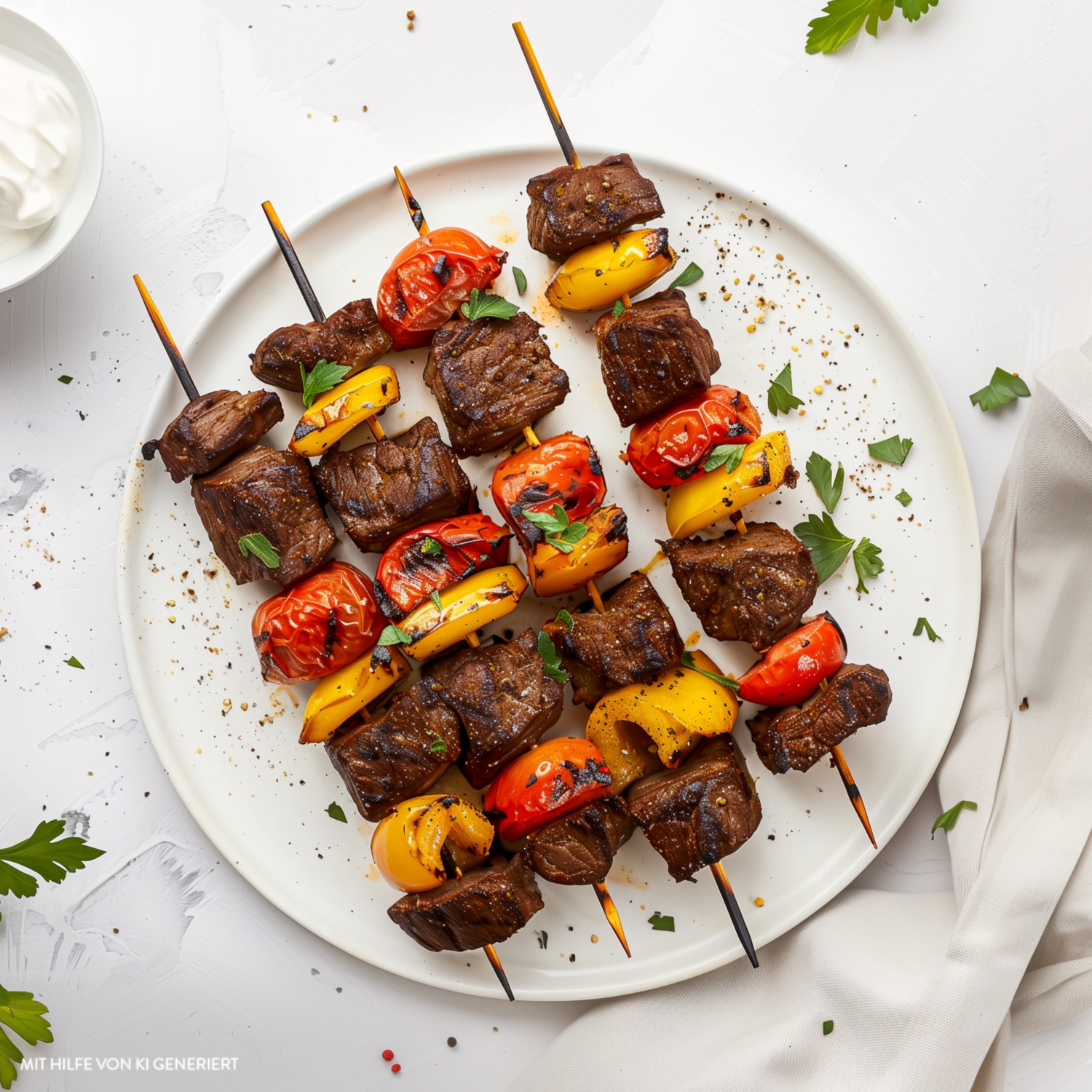 Knusprige Spieße mit Rindfleisch, Paprika und Tomate. Frisch vom Rost für deinen Grillabend. Zum Rezept