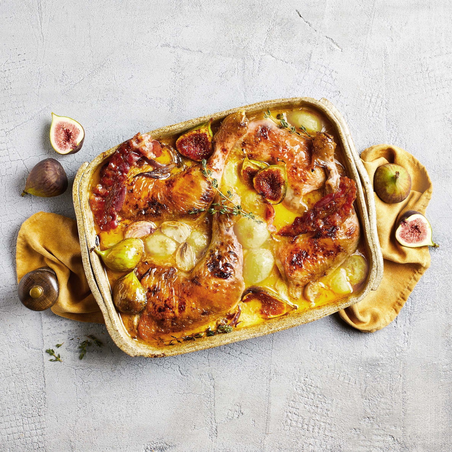 6. Die Feigen waschen, aufschneiden und zusammen mit den Kartoffeln, Knoblauch, ausgelassenem Bacon und Zwiebeln, sowie dem Thymian in den Bräter geben.
