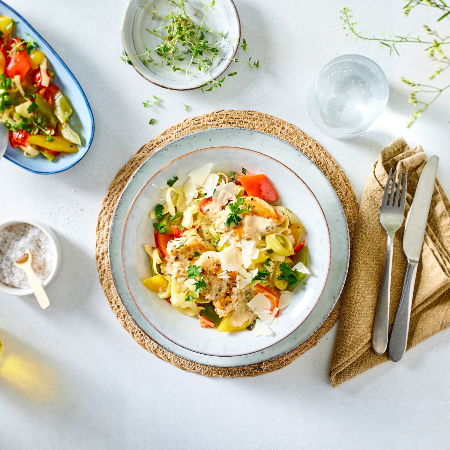 Hähnchen-Medaillons in Rahmsauce, Paprika-Lauchgemüse und Nudeln