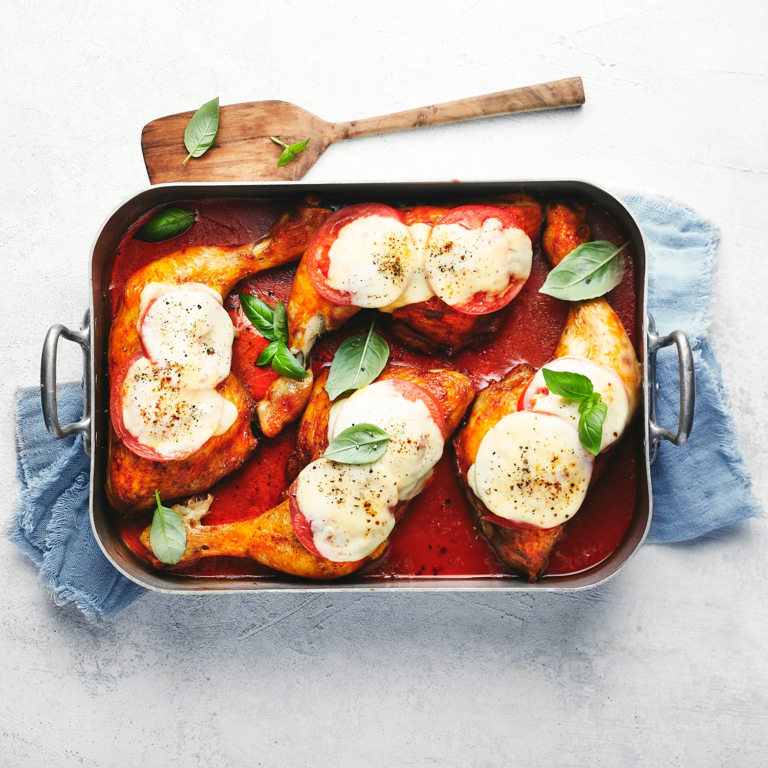 Hähnchenschenkel mit Tomaten und Mozzarella überbacken