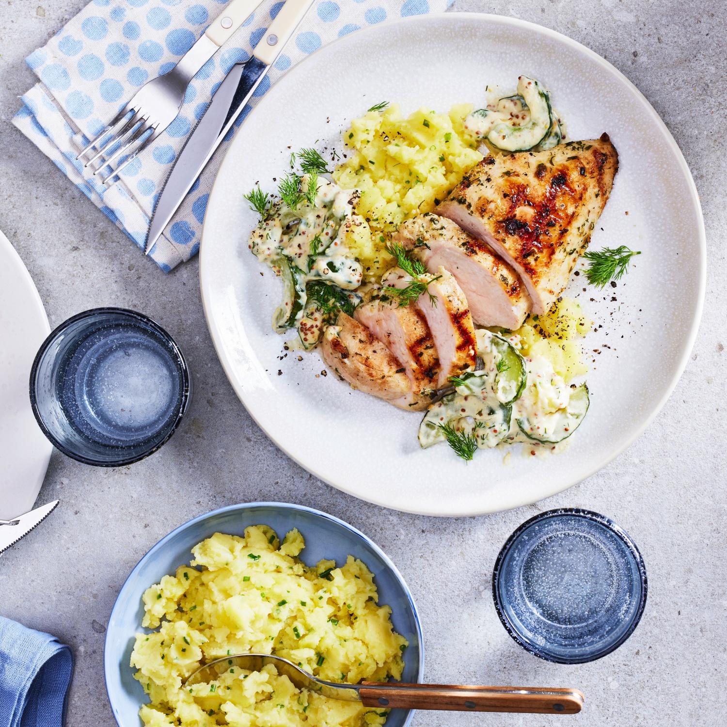 - Die Hähnchensteaks zusammen mit dem Gurkengemüse und Kartoffelstampf servieren.