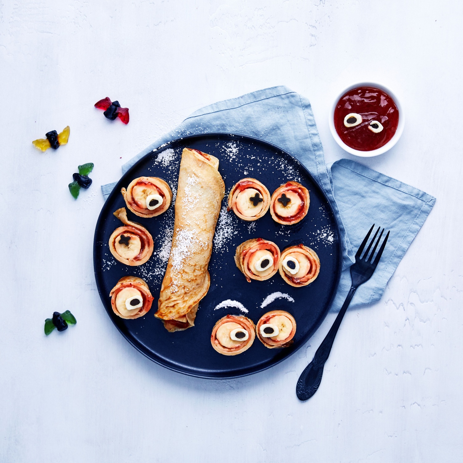 Halloween-Überraschung, die immer gelingt: Die klassischen Pfannkuchen werden mit ganzen Bananen gefüllt und als Halloween-Fratzen arrangiert. Die rote Marmelade ergänzt den Gruseleffekt perfekt. Zum Rezept