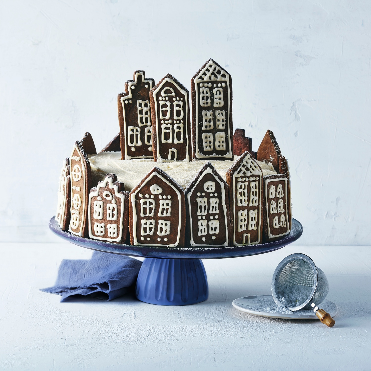 - Das Frosting gleichmäßig mit einem Spatel oder Palettenmesser auf dem Kuchen und an den Seiten auftragen und glattstreichen. Die Lebkuchenhäuser um den Kuchen herum drapieren.