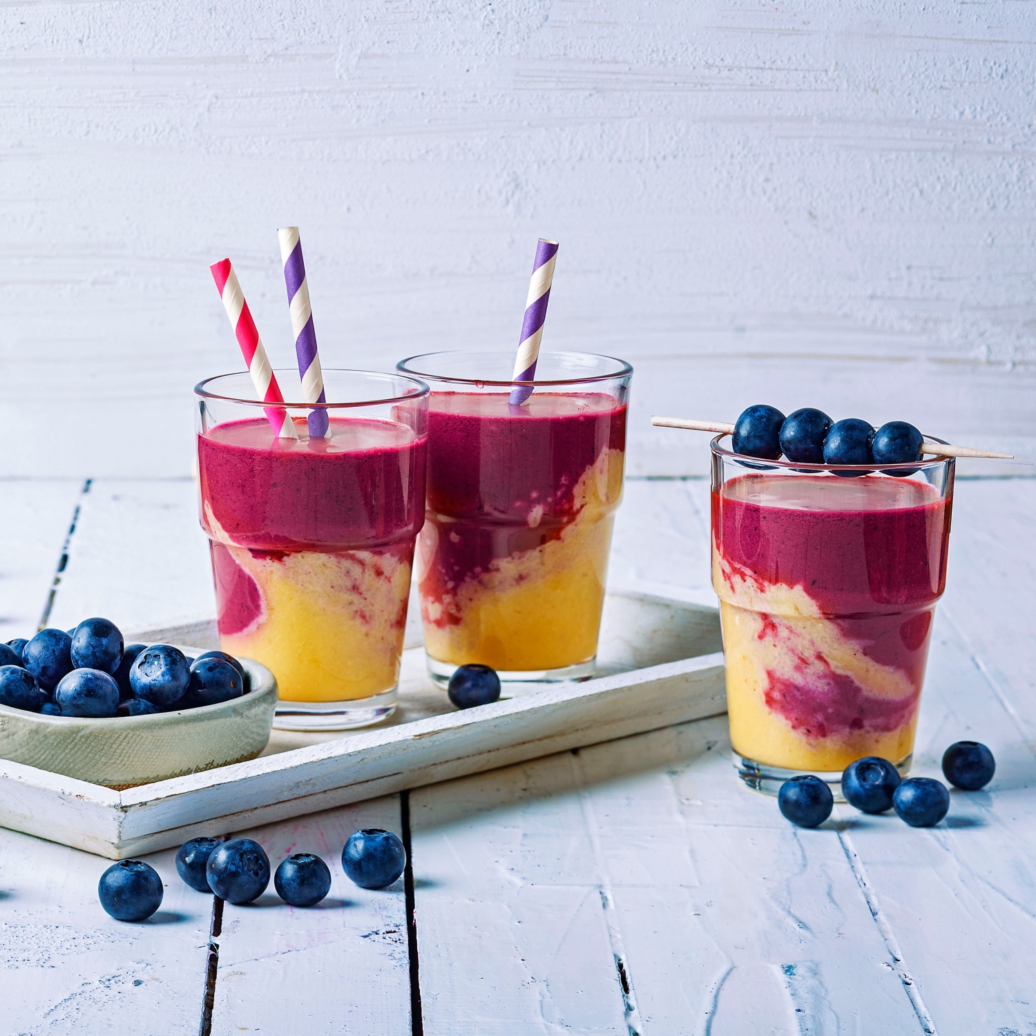 - Zitrone auspressen. Bananen schälen und in Scheiben schneiden. Die Hälfte mit dem Zitronensaft pürieren und in 4 Gläser geben. Die Heidelbeeren mit den restlichen Bananen, Joghurt, Honig und Milch kräftig mixen. Vorsichtig auf das Bananenpüree gießen.