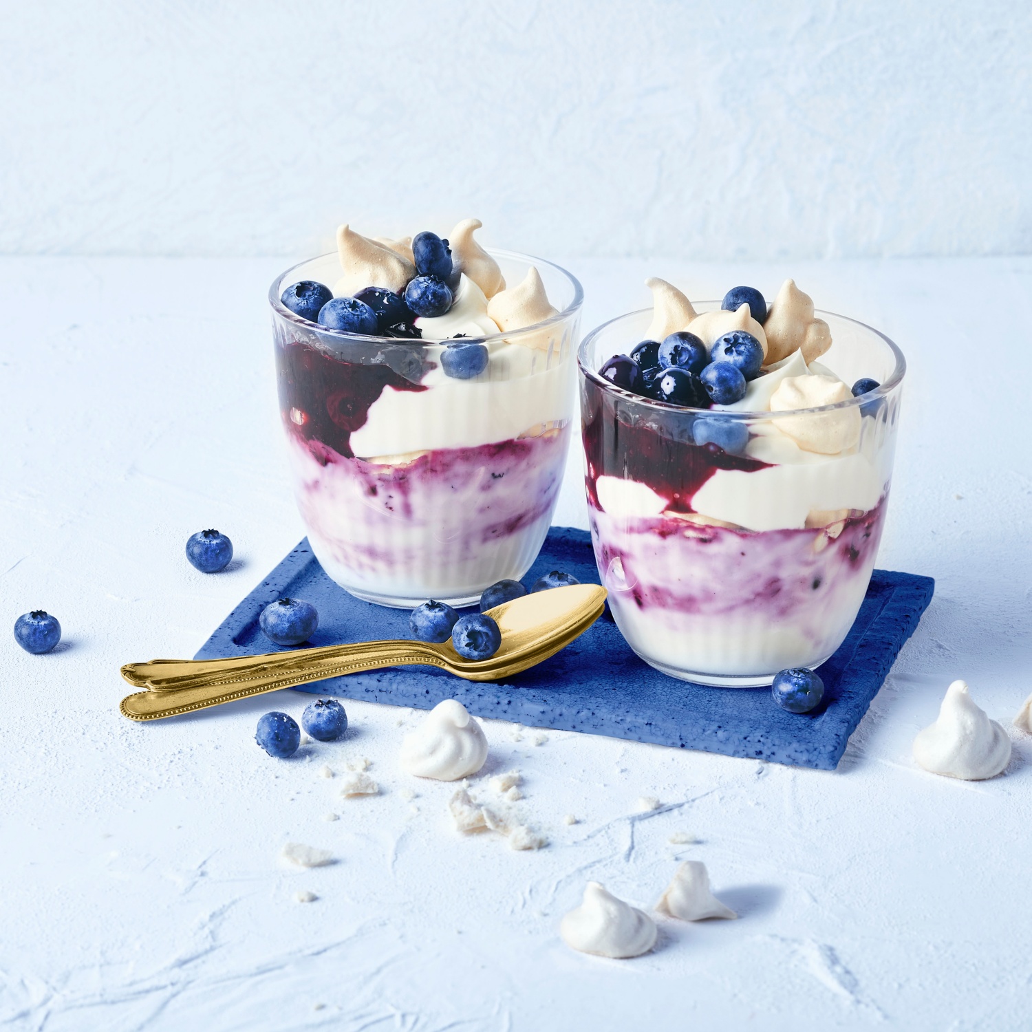- Die zweite Hälfte des Skyr und den Rest der eingekochten Heidelbeeren über die Baisers geben. Die frischen Heidelbeeren mit den restlichen Baisers als Dekoration auf den Gläsern anrichten.