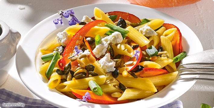 - Nudeln abgießen, mit dem Kürbisgemüse, restlicher Butter und den Frühlingszwiebeln mischen. Pasta auf 4 Tellern anrichten, Schafskäse darüber bröseln und mit den Kernen bestreuen. Nach Geschmack mit essbaren Blüten dekorieren.