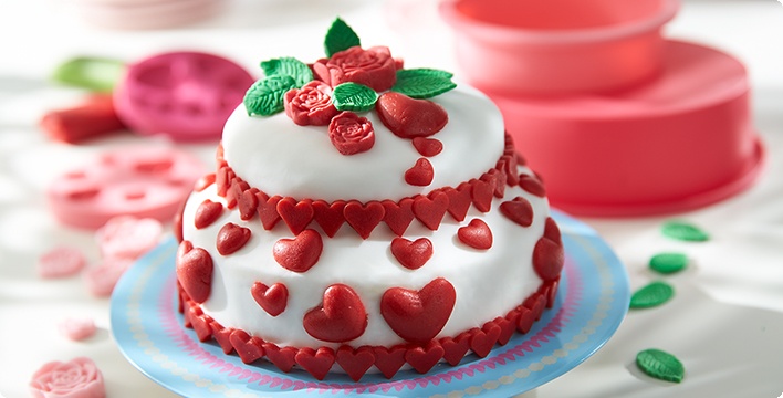 - Mit der Prägematte Prinzessinnenmotive die Herzgirlande ausformen. Etwas roten Marzipan als Rolle formen und mit den Fingern in die Prägematte drücken. Mit dem kleinen Spachtel aus dem Modellierset den Marzipan glattstreichen, so dass die Ränder der Form frei werden. Die Herzchenketten nun vorsichtig aus der Silikonform drücken. Auf den beiden unteren Kanten der Torte platzieren und mit Hilfe des Modellierwerkzeugs leicht andrücken. Die einzelnen Herzchen und Rosen ebenso ausformen und nach Belieben auf der Torte platzieren. Für die Blätter etwas grünen Fondant mit dem Ausrollstab ausrollen. Mit dem Prägestempel Blättchen ausstechen, zu den Rosenblüten setzen und leicht andrücken.
