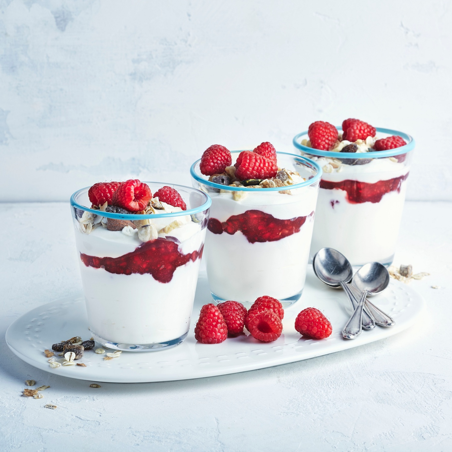 Himmlisch leicht und cremig-fruchtig. Getoppt wird dieses fabelhafte Himbeer-Dessert mit knusprigen Getreideflocken. Zum Rezept