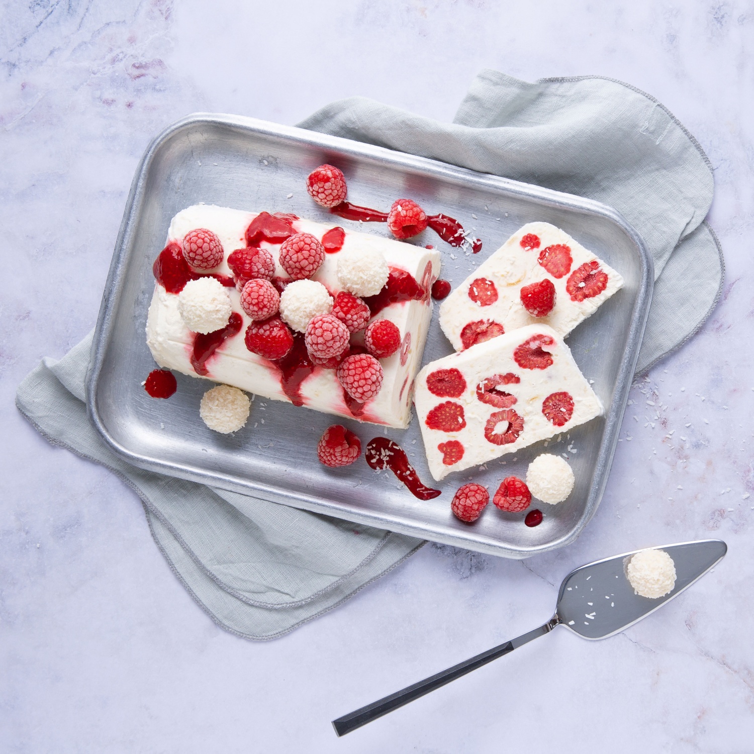 - Das Parfait ca. 10 Minuten vor dem Servieren antauen lassen. Aus der Form stürzen und in Scheiben schneiden. Mit den übrigen Himbeeren und Raffaello garnieren.