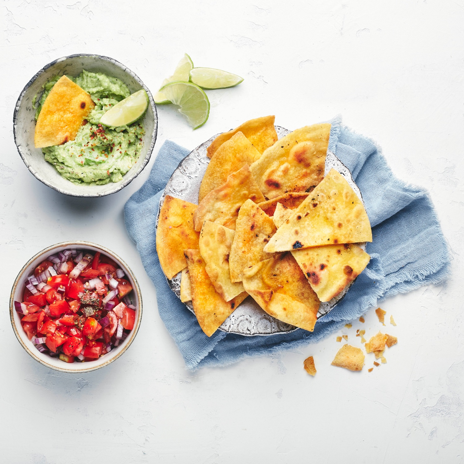 Homemade Tortillachips mit Guacamole und Tomatensalsa