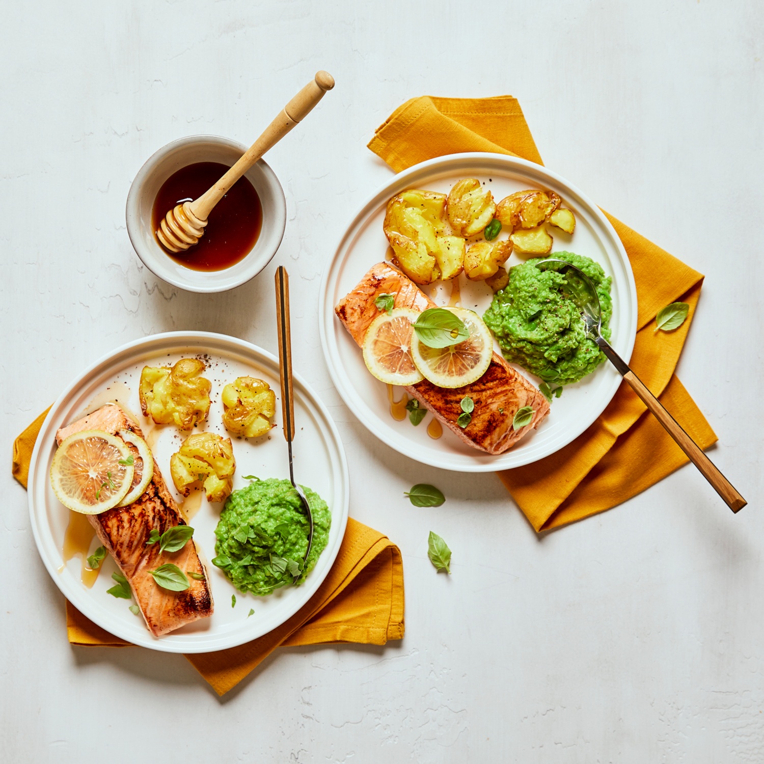 Honig-Lachs mit Smashed Potatoes und Erbsenpüree