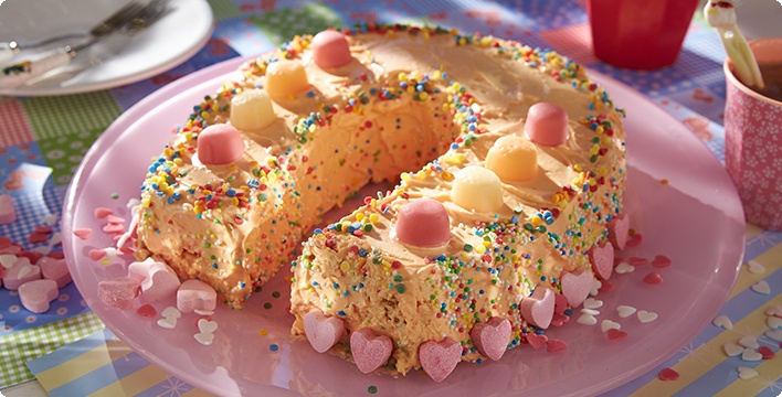 - Die beiden Hufeisenteile trennen und dünn mit Frischkäsecreme bestreichen. Wieder zusammenfügen und rundum mit der Creme bestreichen. Danach mit Liebesperlen, Fruchtgums und Brauseherzen verzieren.