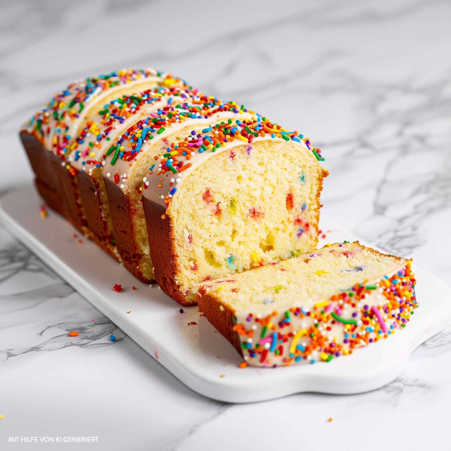 - Den Puderzucker mit Milch und Vanilleextrakt glattrühren. Die Glasur über das abgekühlte Ice Cream Bread gießen und mit den restlichen bunten Streuseln bestreuen.