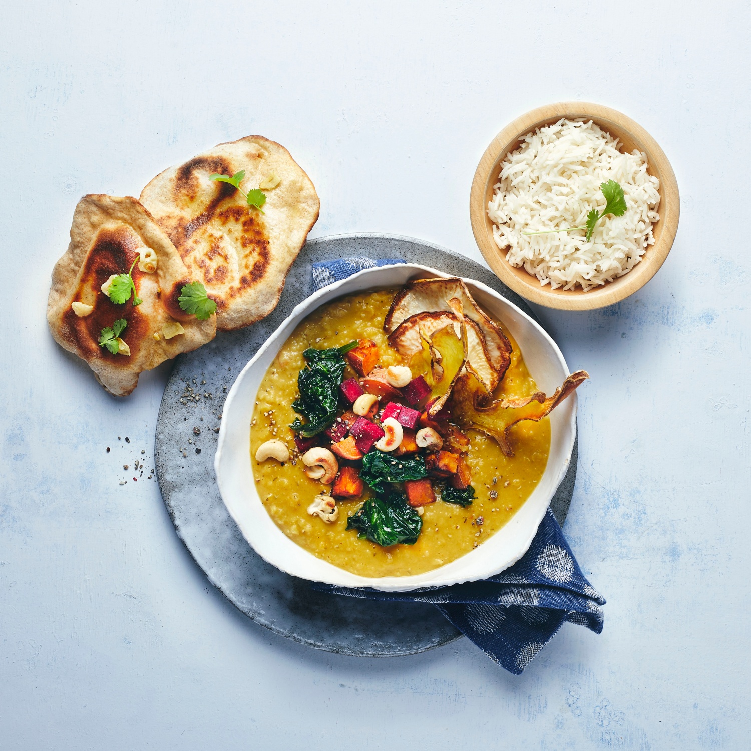 - Das Dal mit Salz, Pfeffer und Curry abschmecken. Mit den Süßkartoffeln, den Rote Bete-Würfeln und den Cashewkernen anrichten.