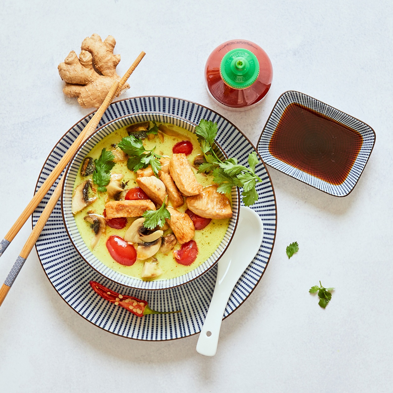 - Die Ingwer-Kokos-Suppe mit dem Geschnetzelten garnieren und mit frischem Koriander servieren.